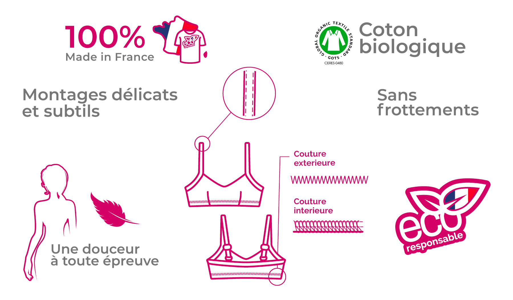 Nous avons choisi une filière 100% française du fil à la finition, afin d’être en phase avec nos valeurs. Parce que vous offrir un vêtement qui respecte votre peau, votre féminité et l’environnement est notre engagement.