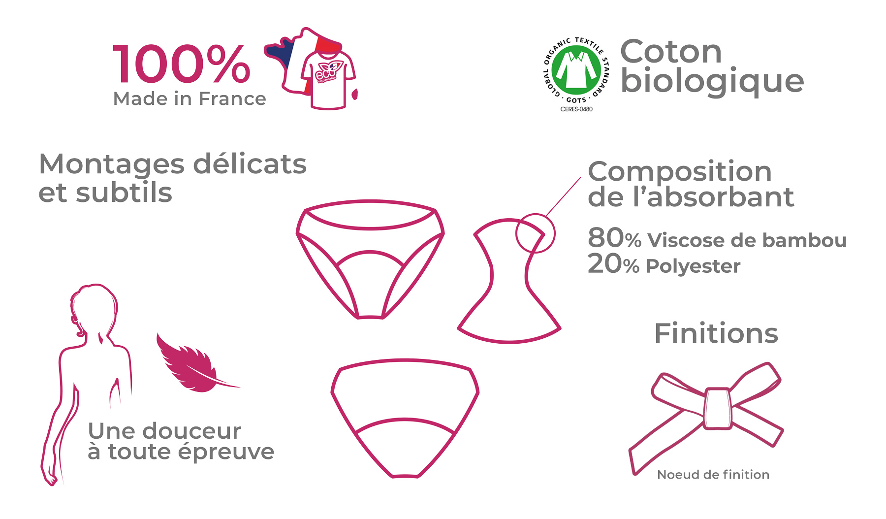 Nous avons choisi une filière 100% française du fil à la finition, afin d’être en phase avec nos valeurs. Parce que vous offrir un vêtement qui respecte votre peau, votre féminité et l’environnement est notre engagement.